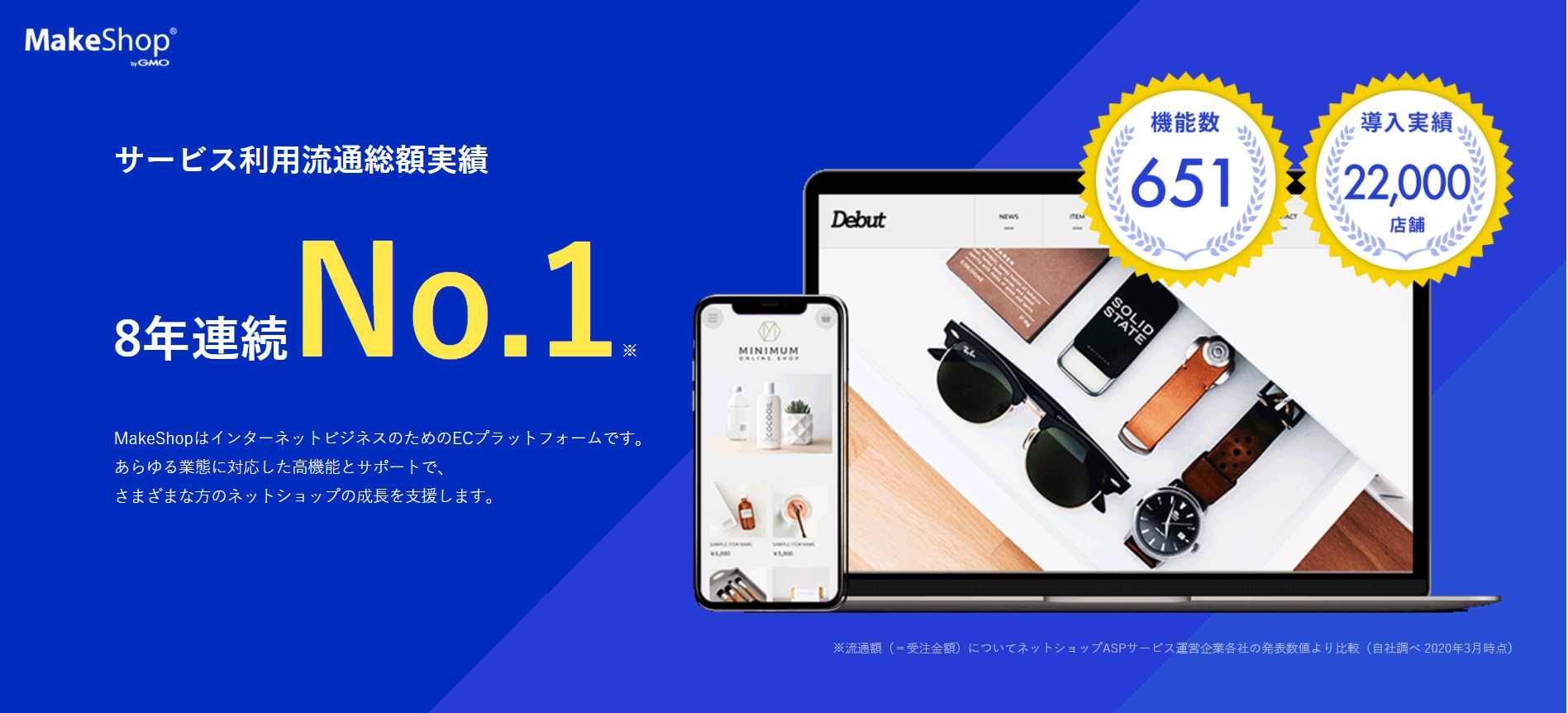 「MakeShop」は、日本国内で22,000店舗の導入実績がある”国内法人様導入数No,1”のカートサービスです。サービス利用流通額の実績はカート業界の中でNo.1を獲得し続けています。機能数も業界No.1の651機能を標準搭載しており、作成から運営・集客までひとつのサービスで行う事が可能です。